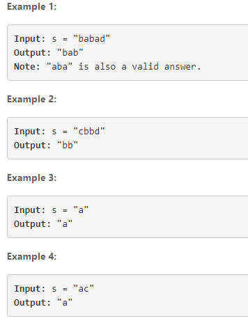 예시 1번처럼 'babad' 는 답이라고 할수있는 값이 'bab','aba' 두 개이다. 이 중 아무거나 반환해주면 된다.