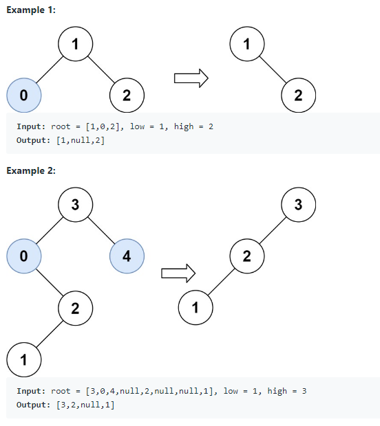 low, high 경계 밖의 값을 제거하면서, BST를 만족해야한다. ( 최초 주어지는 Tree 또한 BST를 만족 )