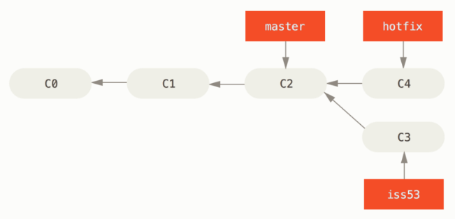 - 상황 : fast-forward merge가 이뤄지는 형상으로 hotfix branch가 master 이후 커밋인 형상이다.