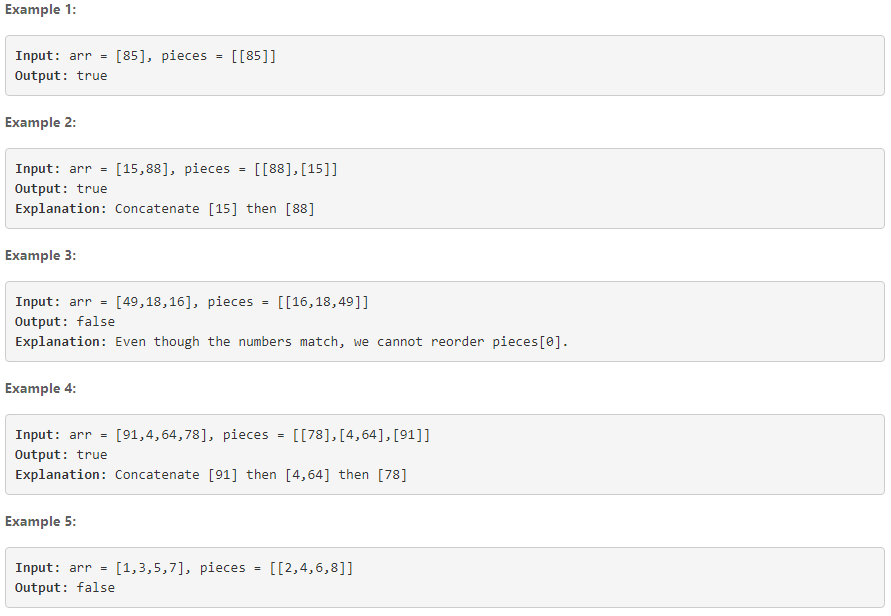2021-01-02] Check Array Formation Through ConcatenationIT/자기계발 ( Leetcode ) 2021. 1. 4. 00:14반응형신년부터 다시 자기계발을 하고자 글을 쓴다. ( 1월1일은 신정이니 한 번 봐주자.. 나 자신 ) 필자는 영어를 잘 못해서 Google님의 도움으로 문제를 읽고, 예시를 보며 문제를 이해한다. ( Thx, google.. ) 그리고, Python으로 문제를 풀고 있어 문제풀이의 경우 python문법으로 풀이한다. 오늘의 문제: Account Login - LeetCode Level up your coding skills and quickly land a job. This is the best place to expand your knowledge and get prepared for your next interview. leetcode.com arr와 pieces라는 List를 주고, pieces의 List 값들로 arr과 동일하게 만들 수 있느냐를 묻는 문제이다. arr는 List[int], pieces는 List[List[int]] 즉 조각난 리스트의 순서를 바꿔가며 arr과 같은지 맞춰보는 것임 ( * 조각나있는 List 안의 값의 순서는 변경하면 안된다.) 예시를 보면서 좀 더 문제를 파악해 보자.  <예시 1 ~ 5> 핵심은 3,4,5이지 않나 싶다. Example 3) - arr: [49,18,16], pieces: [[16,18,49]] - 마치 pieces에서 조각난 List 안의 값을 바꿔 arr를 만들면 될 것 같다. ( [[49,18,16]] 마치 이렇게.. ) 하지만, 설명처럼 우리는 pieces의 조각난 List안의 순서를 재조정 할 수 없다. 그렇기 때문에, False Example 4) - arr: [91,4,64,78], pieces:[[78],[4,64],[91]] - pieces의 1번과 3번을 바꾸면 [[91],[4,64],[78]]이 되고 순서가 arr과 동일하여, True Example 5) - arr: [1,3,5,7], pieces:[[2,4,6,8]] - pieces의 값과 arr가 애초에 같지 않으므로, False 문제풀이) 브루트 포스 기법으로 문제를 풀었다.. (모든 경우의수를 다 찾는거라 3중 for문.. ) class Solution(object): def canFormArray(self, arr, pieces): """ :type arr: List[int] :type pieces: List[List[int]] :rtype: bool """ res=[] rtype=True for a in range(len(arr)): # arr의 길이만큼 반복 for piece in pieces: # pieces에서 하나씩 조각난 List값을 얻는다. if arr[a] in piece: # 만약 한개의 조각난 List piece에서 arr의 값이 있다면 for pic in range(len(piece)): # piece의 길이만큼 반복 if a+pic >= len(arr): continue if arr[a+pic] == piece[pic]: #piece의 다음값과 arr의 값이 같으면 res에 add if piece not in res: #중복되는 값이 없도록 res.append(piece) res2=[] for i in range(len(res)): # 조각난 piece를 합친거라 extend로 arr처럼 하나의 List로 만들어줌 res2.extend(res[i]) if arr != res2: # arr가 res2와 다르면 False return rtype=False return rtype반응형'IT > 자기계발 ( Leetcode )' 카테고리의 다른 글2021-01-07] Kth Missing Positive Number (0) 2021.01.07 2021-01-06] Remove Duplicates from Sorted List II (0) 2021.01.06 2021-01-05] Merge Two Sorted Lists (0) 2021.01.05 2021-01-04] Beautiful Arrangement (0) 2021.01.04 2021-01-03] Find a Corresponding Node of a Binary Tree in a Clone of That Tree (0) 2021.01.04